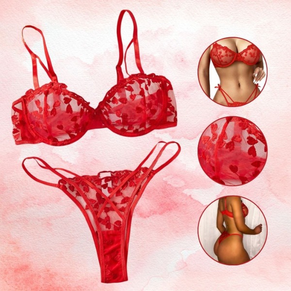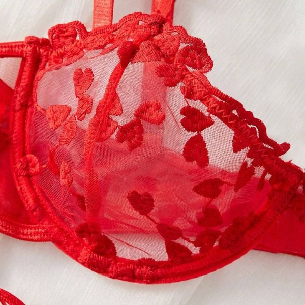 Šis sarkanais apakšveļas komplekts ir lieliska izvēle Valentīna dienai! Šis komplekts ar sarežģītiem sirds izšuvumiem un maigām caurspīdīga sieta detaļām ir radīts, lai vairotu jūsu romantisko valdzinājumu.
