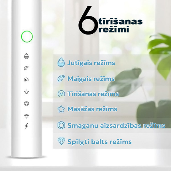 Neatkarīgi no tā, vai Jums ir jutīgi zobi vai nepieciešama ikdienas tīrīšana, 6 režīmi ir izstrādāti, lai apmierinātu dažādas zobu vajadzības un nodrošinātu optimālu komfortu.